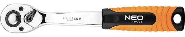 Manico a cricco reversibile con impugnatura bimateriale. Meccanismo a cricchetto a 72 denti. In acciaio cromo vanadium. DIN 3122.